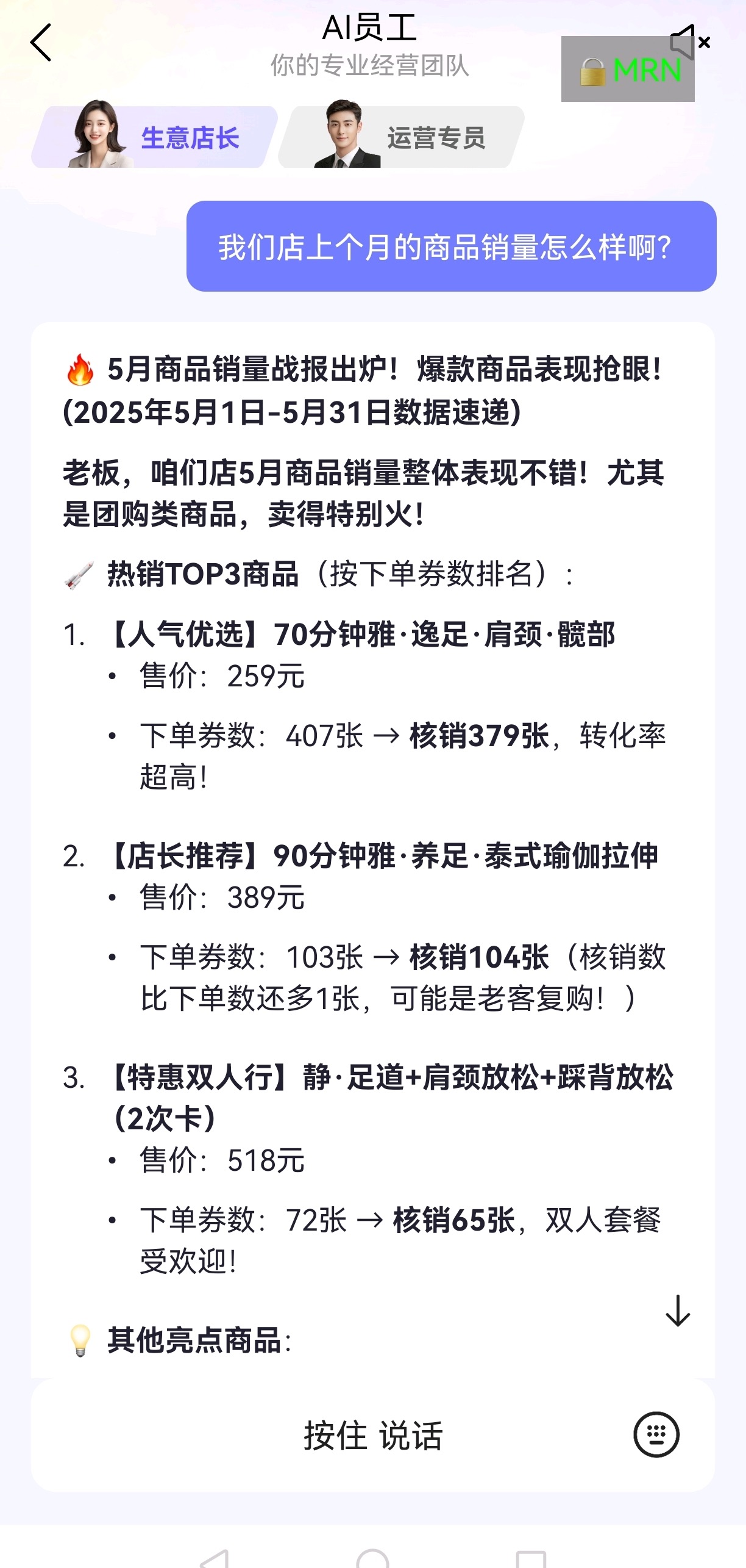 對此,陸先生感觸頗深:“每周,生意店長在分析時都會提醒我,同行的熱賣團購有哪些,我們門店的套餐哪里需要優化。比如最近天氣熱,它就建議我上線夏日養生套餐?!?/p>