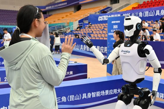 2025長三角(昆山)具身智能場景應用大賽機器人應用比賽上,人形機器人與觀眾互動。張從余攝(影像中國)