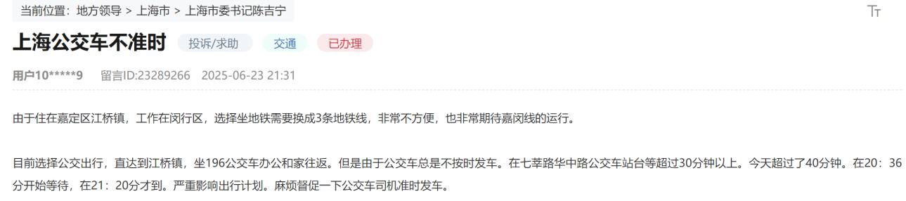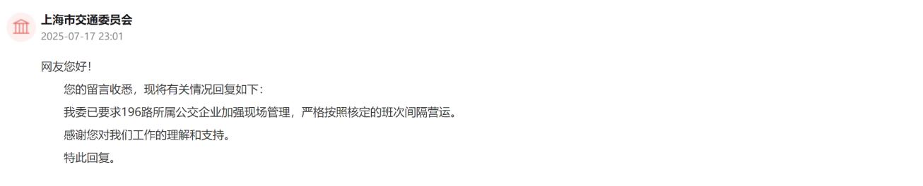 收到網友留言反映的情況后,上海市交通委員會高度重視,已要求196路所屬公交企業加強現場管理,嚴格按照核定的班次間隔運營。【點擊查看留言】