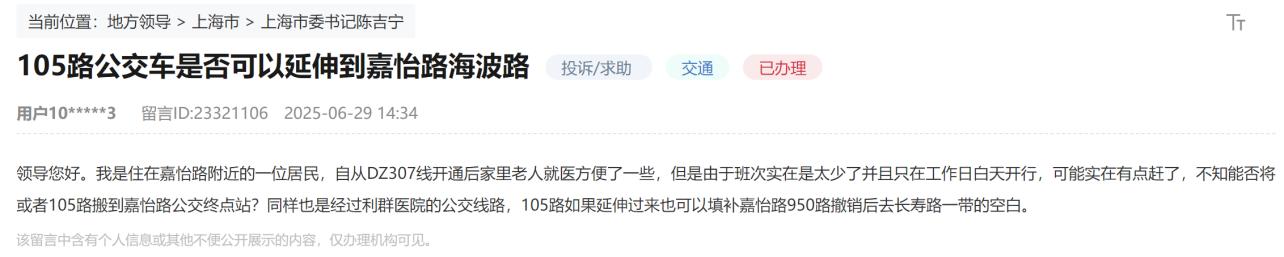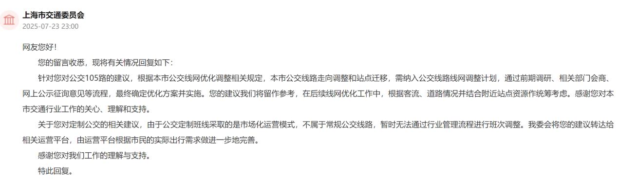 另外,有網友反映DZ307線班次太少并且只在工作日白天開行,建議將105路公交車延伸到嘉怡路,填補950路撤銷后去長壽路一帶的空白。