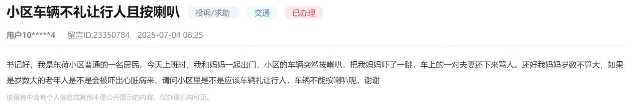 有網友投訴東荷小區內,一車輛突然按喇叭嚇到老人,車上夫妻還有言語辱罵的行為。對此,他提出“小區里是不是應該車輛禮讓行人,車輛不能按喇叭”的疑問。