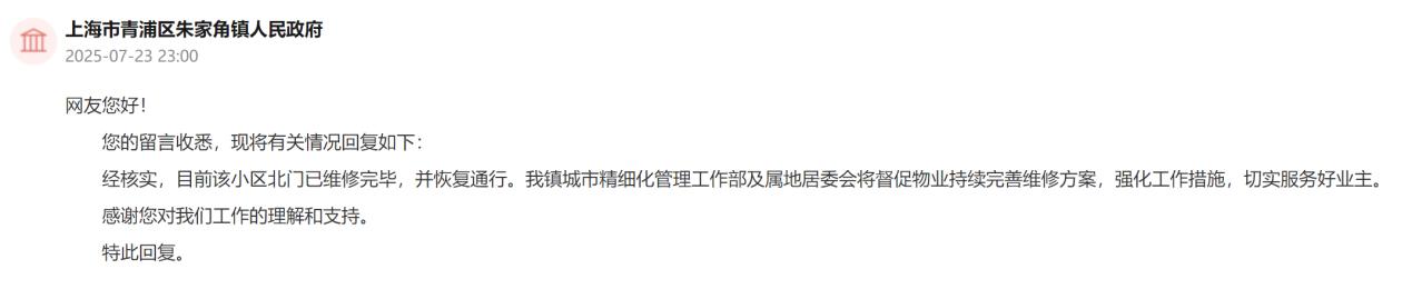 收到網友留言反映的情況后,上海市青浦區朱家角鎮人民政府高度重視。該鎮城市精細化管理工作部及屬地居委會將督促物業持續完善維修方案,強化工作措施,切實服務好業主。【點擊查看留言】