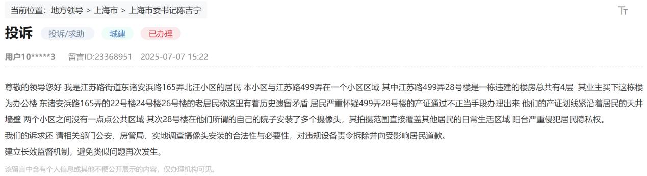 有網友投訴江蘇路499弄28號樓是違建樓房,且在院內安裝多個像頭,“其拍攝范圍直接覆蓋其他居民的日常生活區域”,侵犯居民隱私權。對此,他希望相關部門實地調查攝像頭安裝的合法性與必要性,對違規設備責令拆除并向受影響的居民道歉。