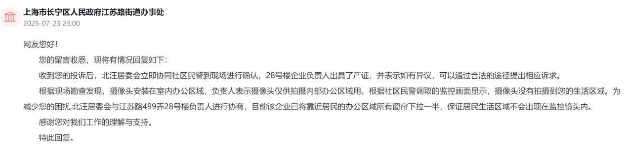 收到網友留言反映的情況后,上海市長寧區人民政府江蘇路街道辦事處高度重視。相關部門已到現場進行確認,28號樓企業負責人出具了產證。根據現場勘查發現,攝像頭僅供拍攝內部辦公區域用,且沒有拍攝到居民的生活區域。協商后,該企業已將靠近居民的辦公區域所有窗簾下拉一半,確保居民的隱私不被侵犯。 【點擊查看留言】