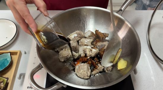 2.熱鍋冷油,加入姜片,排骨炒至水汽蒸發,加料酒、生抽、老抽翻炒均勻。