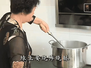將綠豆燒稀燒酥,加入冰糖。冰糖融化后,倒入拌好的糯米粉。