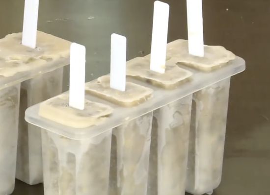 綠豆湯液放涼,倒入準備好的模具中,冰箱冷凍5小時,即可食用。