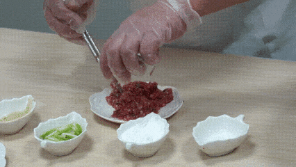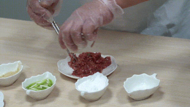 3.肉末加蔥花、蔥姜水、淀粉上漿。