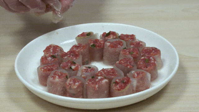 4.把腌制后的冬瓜卷成圓柱狀,內部用肉末填充,擺放成花朵狀。