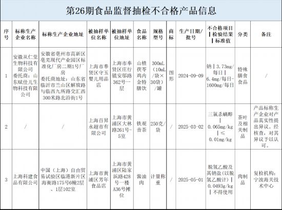 上海市市場監管局介紹,2025年第26期省級食品安全抽檢信息發布。本次抽檢信息涉及7大類食品,包括:茶葉及相關制品、炒貨食品及堅果制品、豆制品、方便食品、肉制品、特殊膳食食品和飲料。抽檢樣品共計626批次,其中合格623批次、不合格3批次。詳見↓