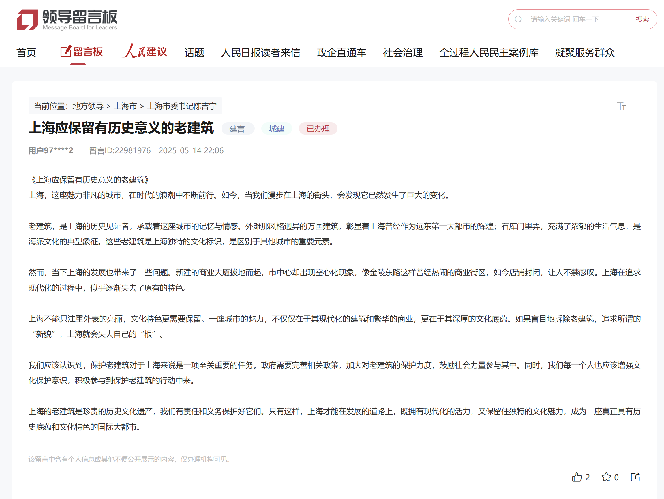 該網友建議:政府完善相關政策,加大對老建筑的保護力度,鼓勵社會力量參與,在現代化進程中守住城市“根脈”。同時,建議市民增強文化保護意識,積極參與到保護老建筑的行動中來?!爸挥羞@樣,上海才能在發展的道路上,既擁有現代化的活力,又保留住獨特的文化魅力,成為一座真正具有歷史底蘊和文化特色的國際大都市?!?/p>