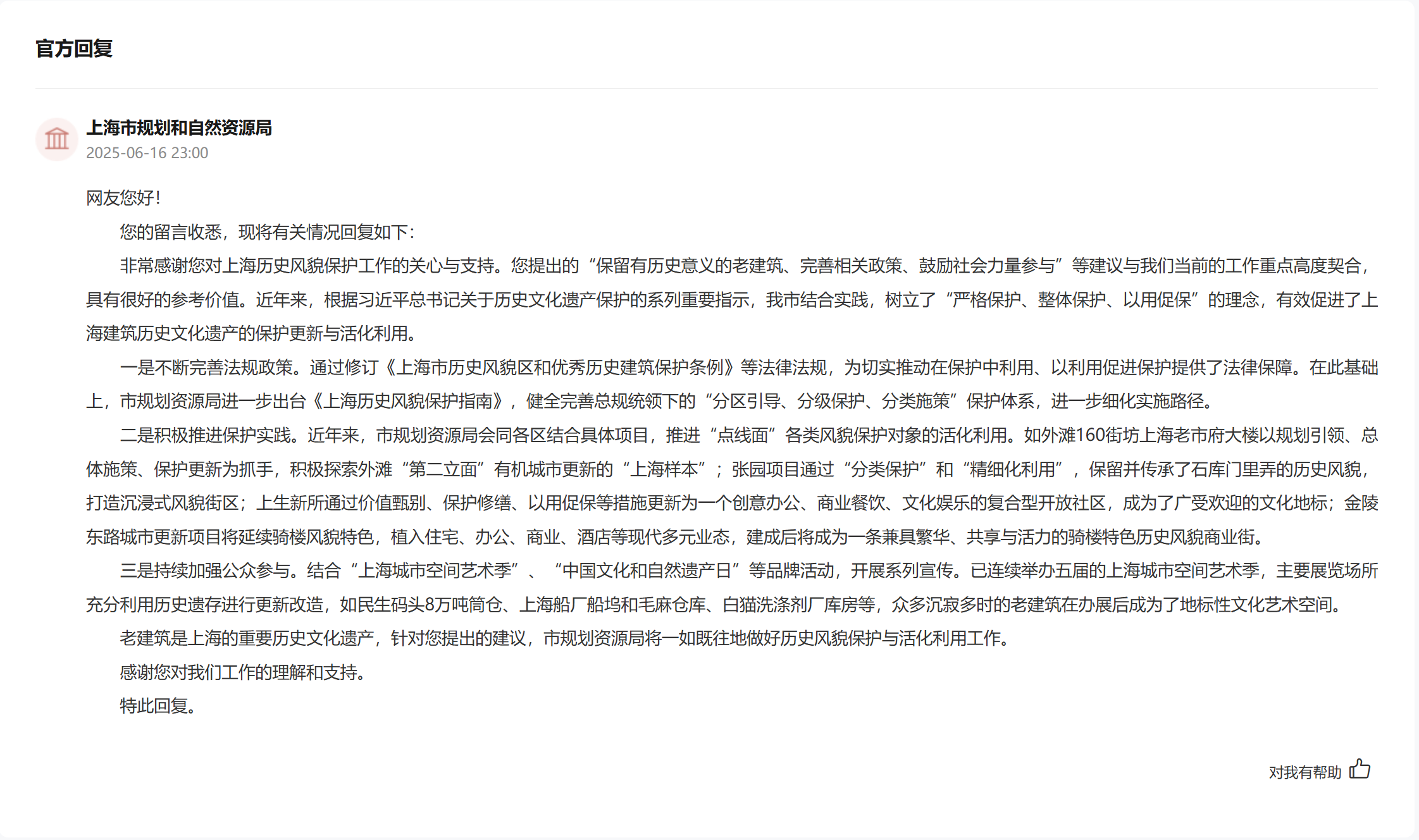 上海市規劃和自然資源局回應稱,該網友提出的建議與上海當前的工作重點高度契合,具有很好的參考價值。老建筑是上海的重要歷史文化遺產,上海將圍繞不斷完善法規政策、積極推進保護實踐、持續加強公眾參與等方面,一如既往地做好歷史風貌保護與活化利用工作。