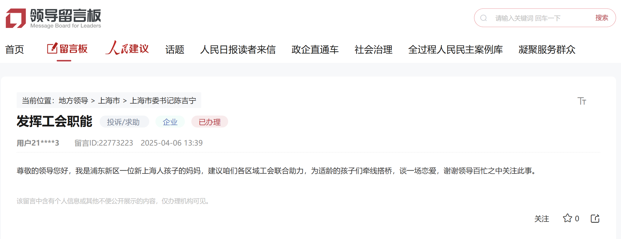 在人民網“領導留言板”上,一位網友表達了對子女婚戀問題的關切,建議上海工會組織為適齡青年牽線搭橋。