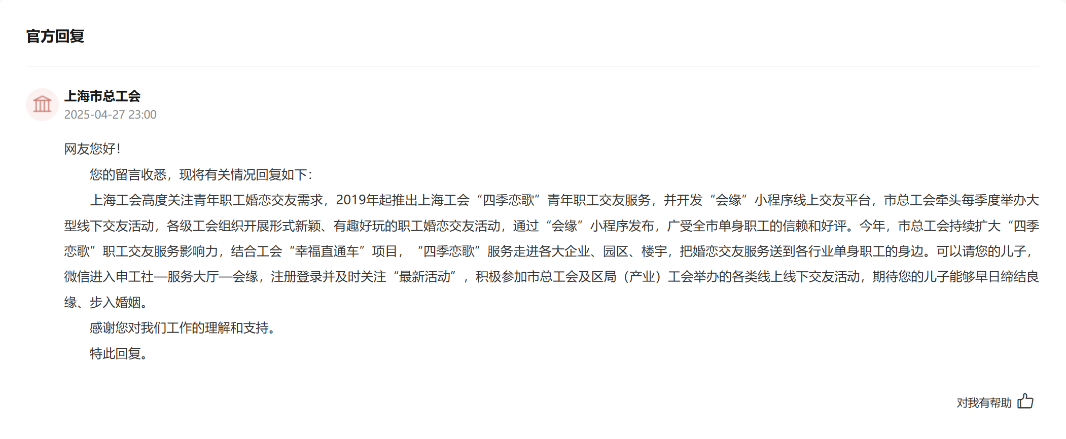 針對網友留言,上海市總工會迅速回應,表示高度關注青年職工婚戀交友需求。自2019年起,上海推出“四季戀歌”青年職工交友服務,并開發“會緣”小程序線上交友平臺。每季度牽頭舉辦大型線下交友活動,各級工會組織也開展形式新穎、有趣好玩的職工婚戀交友活動,并通過“會緣”小程序及時發布,這些活動廣受單身職工的信賴和好評。