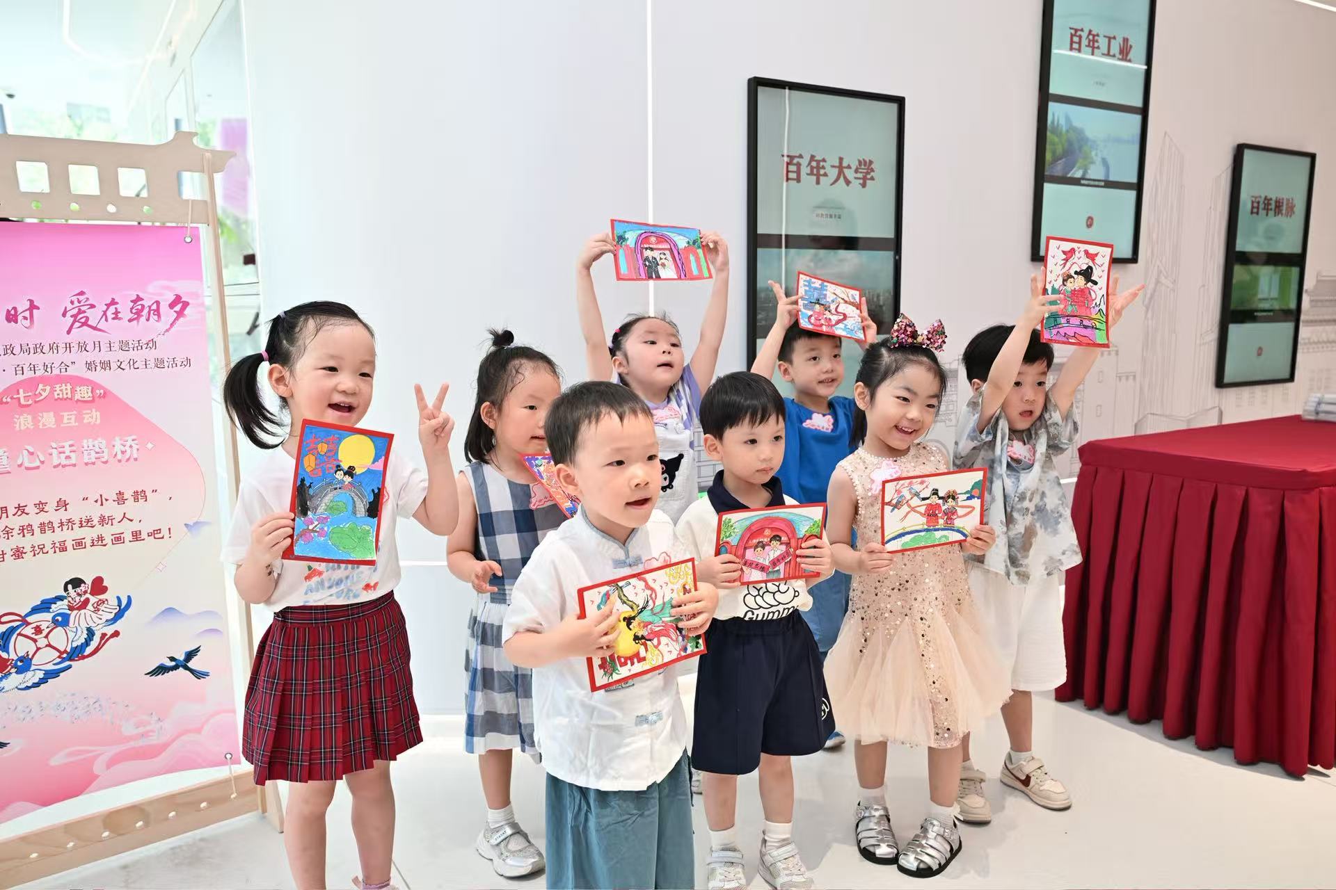 活動現場,新人們齊聲宣讀結婚誓言,許下相伴一生的美好承諾。民辦樂又靚幼兒園的8位“小花童”化身“小喜鵲”,用畫筆繪出心中的鵲橋,以純真童趣送上最美祝福。