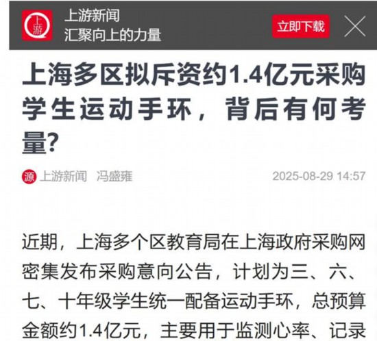媒體報道上海多個區教育局發布采購運動手環的意向公告。網絡截圖