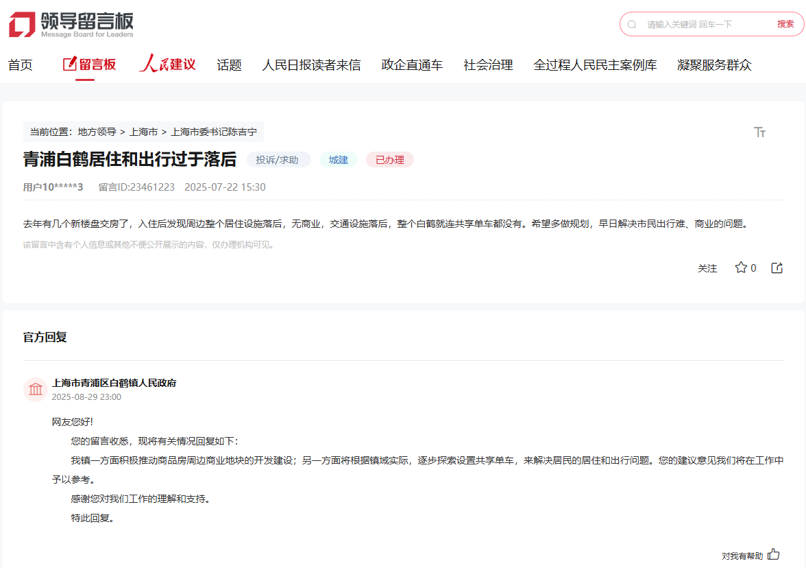針對網友留言,上海市青浦區白鶴鎮人民政府表示將“雙管齊下”:一方面積極推動商品房周邊商業地塊的開發建設;另一方面將根據鎮域實際,逐步探索設置共享單車,來解決居民出行“最后一公里”難題。