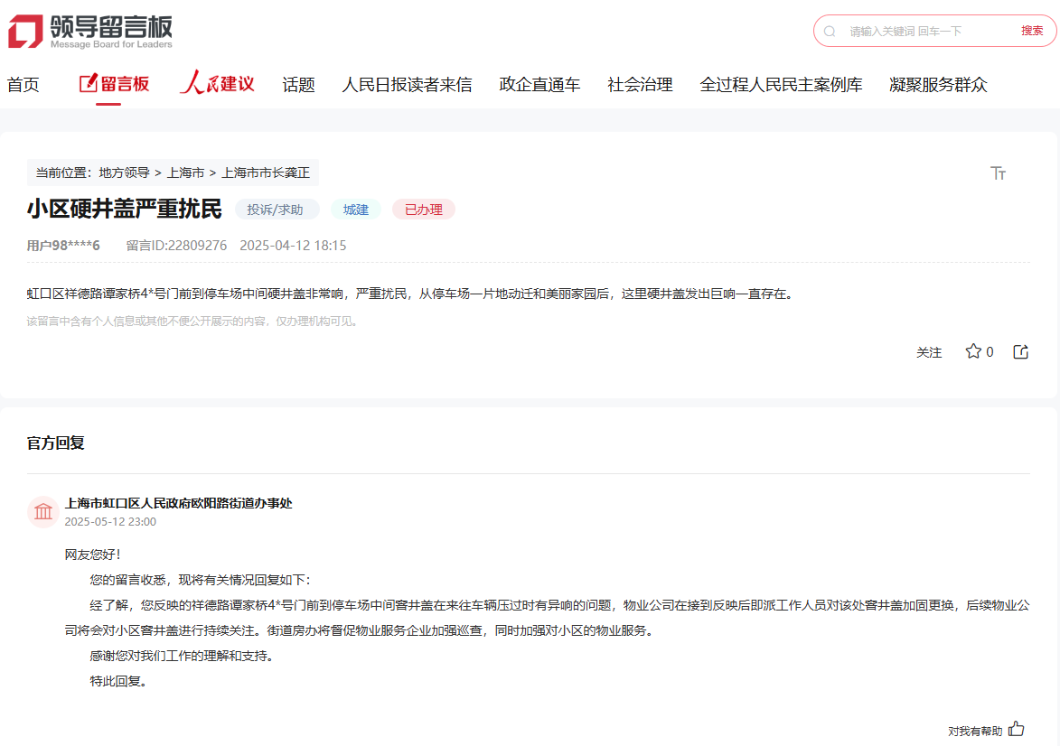 有網友反映,虹口區祥德路譚家橋某小區窨井蓋在車輛經過時產生異響,嚴重影響休息。