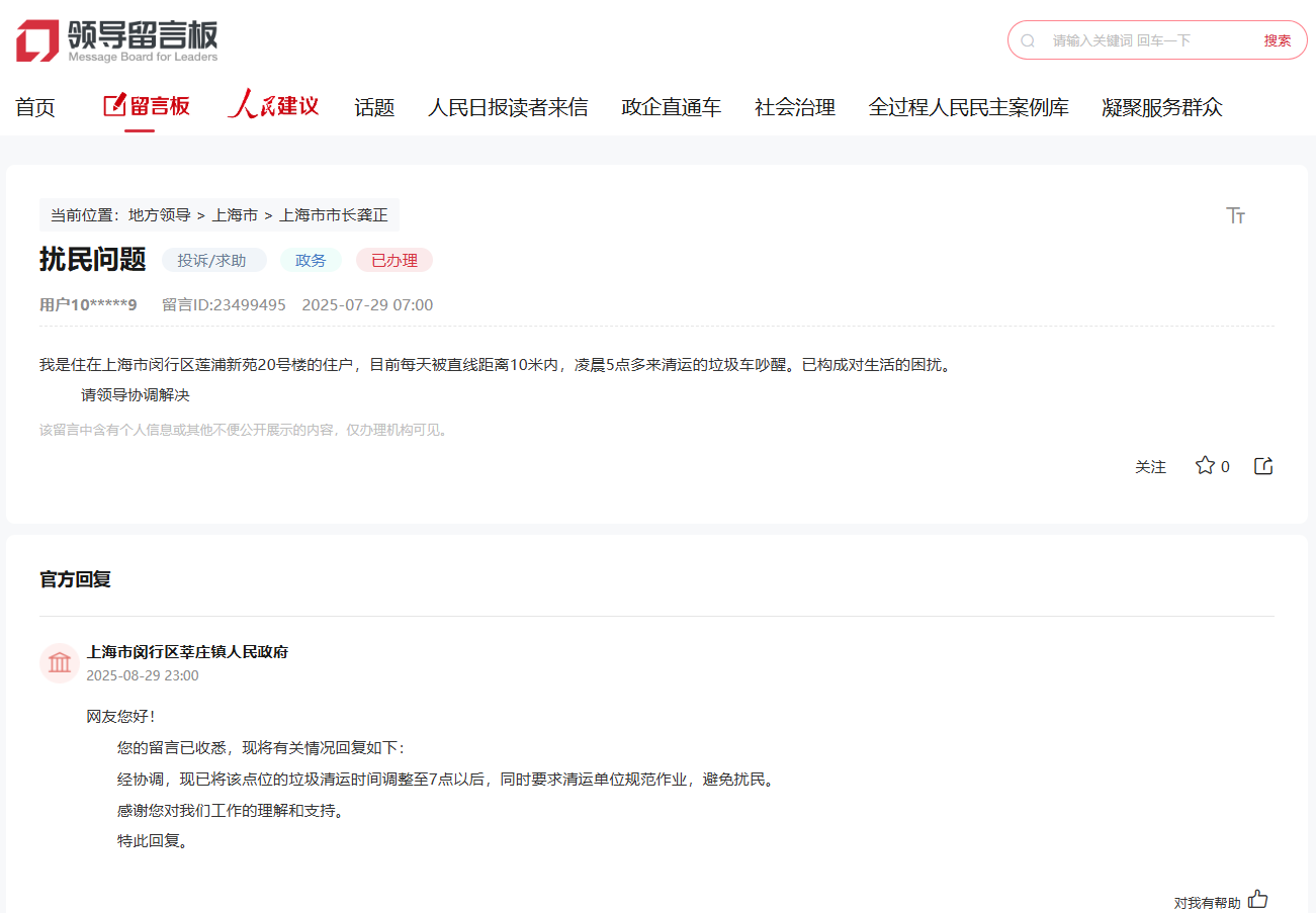 針對網友反映的問題,上海市閔行區莘莊鎮人民政府高度重視,經協調,現已將該點位的垃圾清運時間調整至7點以后,同時要求清運單位規范作業,避免擾民。