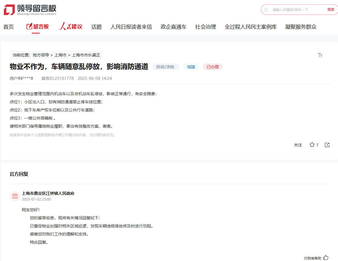 對此,上海市嘉定區江橋鎮人民政府積極回應,已督促物業加強對相關區域巡邏,發現車輛違規停放將及時進行勸阻。