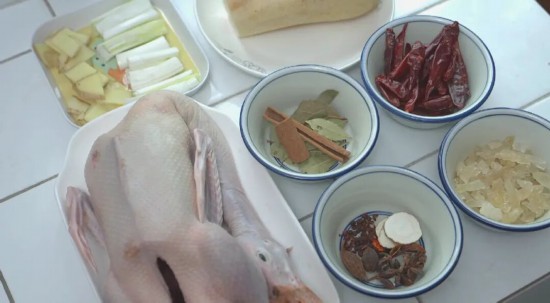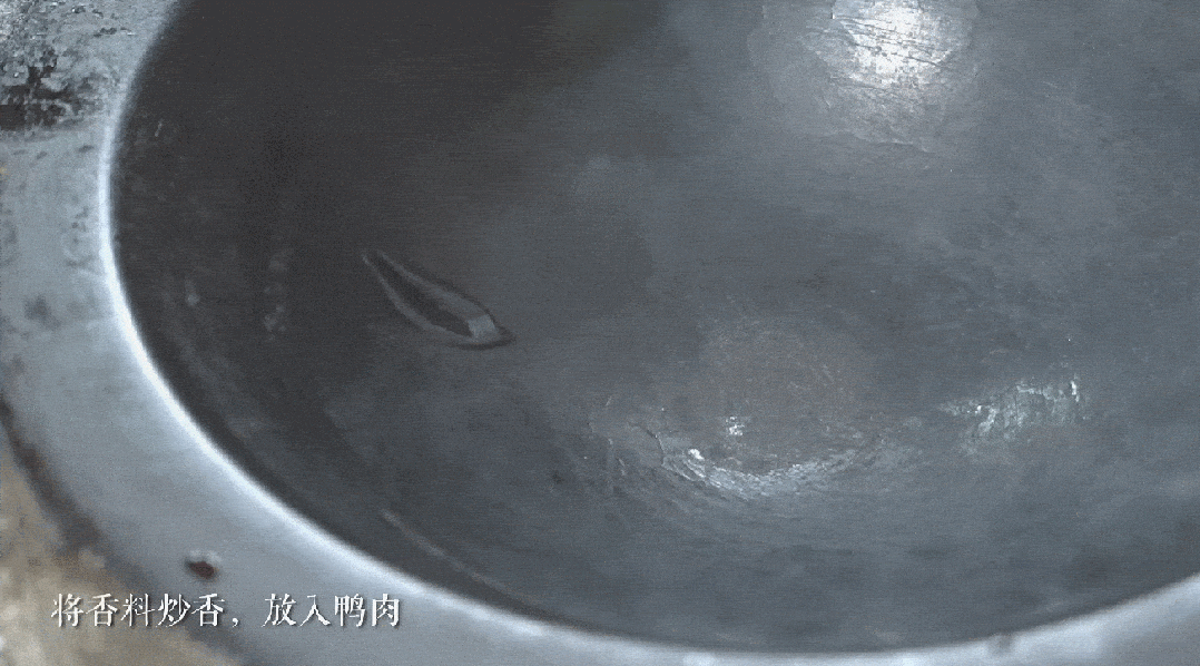 5.鍋內熱油,放入生姜、蔥、香葉、桂皮、八角、紅辣椒、鴨肉,翻炒