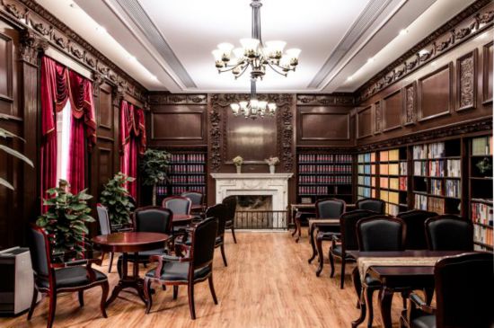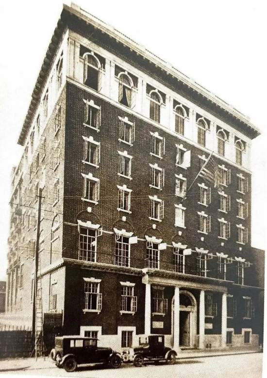 原花旗總會是鄔達克在克利洋行時期最具影響力的代表作,建筑造型采用歐洲文藝復興時期新古典派威尼斯式,立面呈豎向三段式劃分:底層設三開間塔司干柱淺門廊,外墻以美國進口棕色面磚飾面,配白水泥勾縫與白色大理石線腳;二層設落地長窗及出挑陽臺,二至五層窗口飾白色平券楣;頂層為雙壁柱券窗,形成視覺反差。建筑輪廓莊重而富于變化,室內延續美洲殖民風格,深色木飾與古典淺壁柱、白色門框相映,地面鋪米色大理石或深色橡木地板,初建時娛樂設施完備。