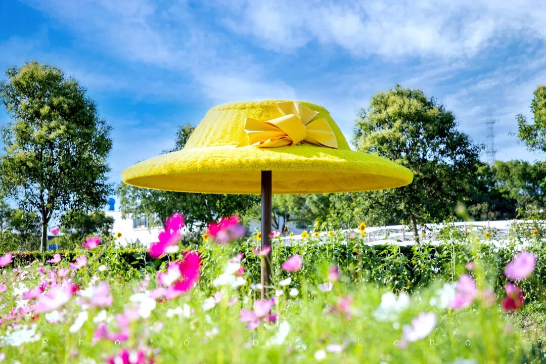 一頂?巨型黃色草帽自帶“網紅感”,草帽頂部系著同色系的蝴蝶結,下方是繁茂的花海,粉色、白色的花朵層層疊疊,葉片鮮綠,營造出蓬勃生機。整體氛圍清新明亮,在這里拍照打卡,視覺沖擊與創意感滿滿,游客可以輕松拍出創意合影,如“鉆進草帽”“戴上草帽”等,照片辨識度極高!