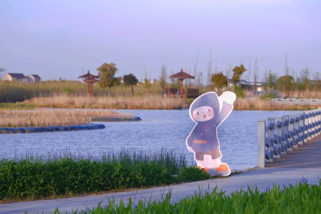 在漕涇水窠景區,水系貫穿整個景區,形成了?“水脈縱橫、亭橋映波”? 的景象。而其中的水小酷形象立牌就是景區內拍照打卡的“隱藏款”,隨機掉落在景區各處。水域的開闊與植被的生機,讓照片自帶“自然松弛”的底色,隨手一拍都像“電影感”濾鏡,而與水小酷互動合拍,能讓照片更加靈動俏皮,木質涼亭、卡通裝置等人文元素與自然景觀融合,照片既有自然野趣,又不失設計巧思,能拍出“清新治愈”的風格。
