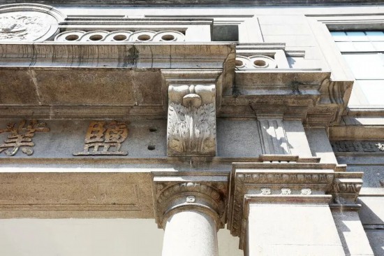 作為新古典主義建筑的典范,鹽業大樓外立面以“橫三縱三”劃分,簡潔而莊重;坐北朝南的建筑布局,以中間大門為中軸線,兩側對稱分布,展現了古典美學的極致平衡。底層石材穩重,檐口出挑優雅。細看窗口線腳,仍可見巴洛克式的細膩處理。建筑入口門楣上方原有圓環浮雕,內刻“鹽業銀行”四個正楷大字,今仍清晰可見。