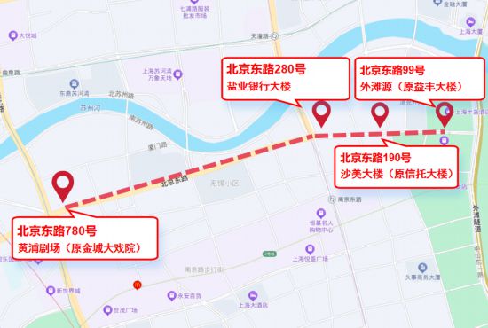 市住建委、市歷保中心介紹,行走于北京東路,宛如穿梭于時間長廊:從十九世紀的洋行建筑,到二十世紀初的新古典主義銀行大樓,再到二十世紀三十年代的現代風格影劇院……不同時期的歷史痕跡層疊交錯,正等待人們去發掘和閱讀。