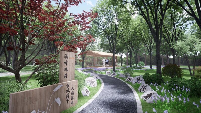 據了解,龍躍村開放休閑林地建設項目以“森態鄉村,荷美龍躍”為設計主題,圍繞“綠荷潭”核心景點,通過一條慢行步道串聯起“藝術園”“芳草園”“果香園”“野趣園”“律動園”五個主題園區,打開原有單一的林地,激活林下空間。