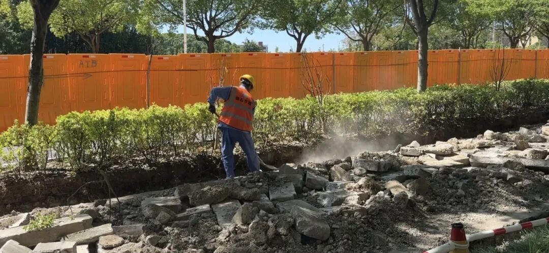 9月4日上午,龍軒路(海豐路—亭衛公路)整治提升項目施工現場一片忙碌,工人忙著翻排側平石,南側人行道的更新已接近尾聲。