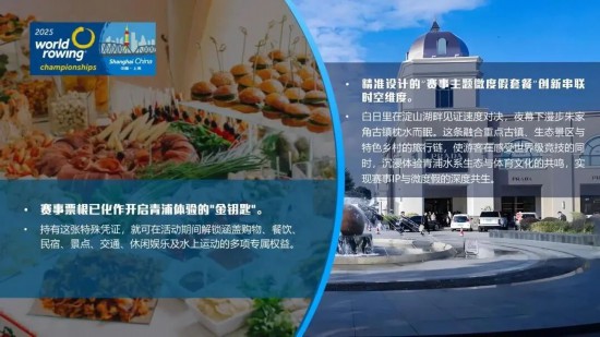 青浦區將推出世界賽艇錦標賽聯動促消費產品,包括“一張票根玩轉青浦”“沉浸式旅行護照”“賽事主題旅游路線”等創新內容。同時持續優化國際消費環境,探索客流共享與活動共聯,促進農文旅商體展全域聯動。詳見↓