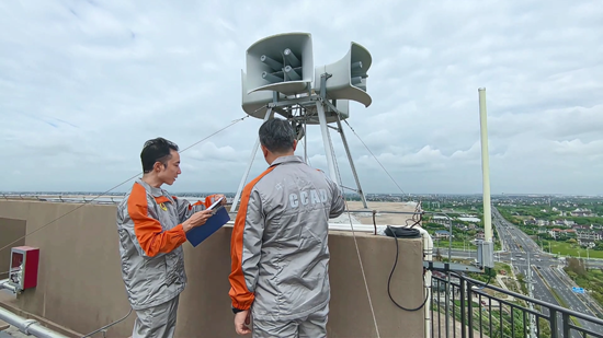 在建金名苑小區的建筑頂樓上,兩名工作人員有條不紊地對可近距離接觸的警報器進行實地檢查,仔細查看警報器表面有無破損、固定螺絲是否松動,以及警報控制箱運行情況。