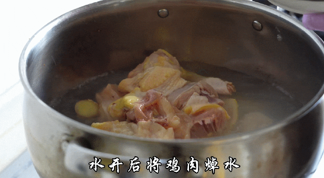 2.鍋內倒水,水開后雞肉焯水,加入黑胡椒粉、蔥、姜、料酒去腥