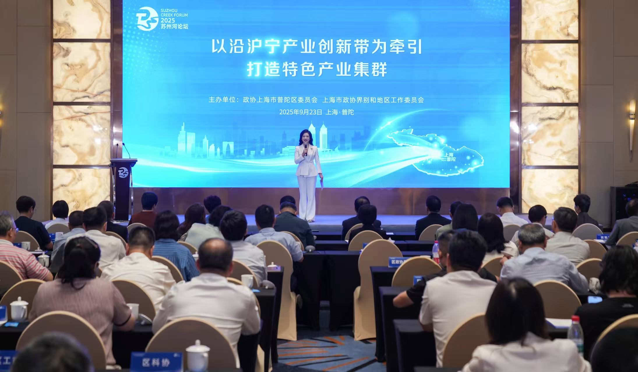 論壇現場,普陀區政協副主席翁華建代表區政協發布2025年重點課題《以沿滬寧產業創新帶為牽引,聚焦打造千億產業集群,著力強化重點產業科創引擎》研究成果。