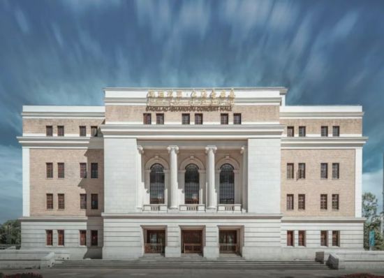 音樂廳為歐洲古典主義風格,采用鋼筋混凝土、砌體與木屋架的混合結構形式,占地面積為4230.8平方米,建筑面積為12986.7平方米。其標志性的正面門樓上部采用兩根半圓形古典圓壁柱和兩根四分之一古典圓壁柱,形成三開間壁龕和3扇圓拱形窗,上方配以浮雕裝飾和雕花屋檐,整座建筑典雅大氣。