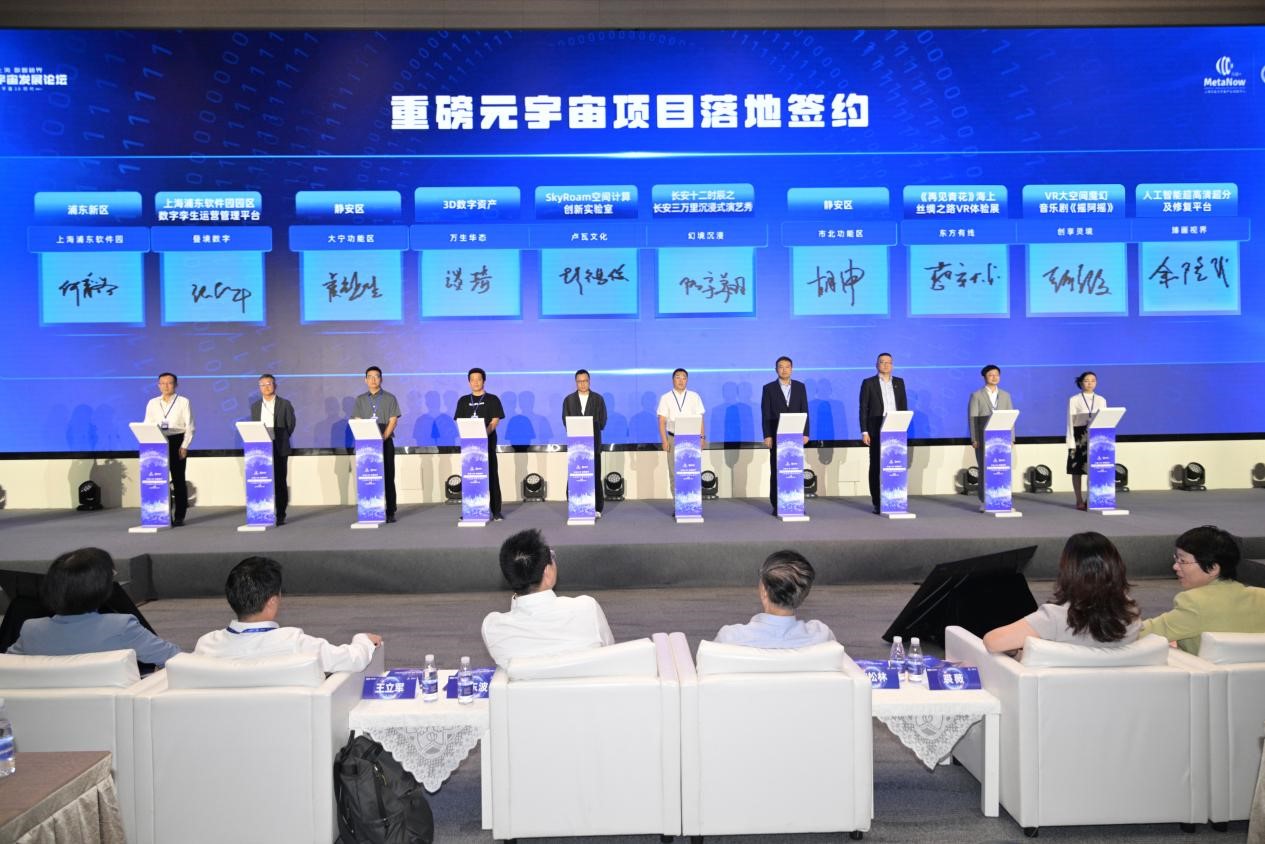 在元宇宙重點平臺發布環節,多個企業代表發布的XR軟硬件適配平臺、空間智能創作及云渲染平臺、大空間數字內容創制平臺,已成為集聚資源、賦能企業、孵化創新的重要基石。在生態構建方面,浦東、徐匯、黃浦、靜安、普陀等區與多家元宇宙領軍企業,就敦煌路上看敦煌、大象元園區落地、上海浦東軟件園園區數字孿生運營管理平臺等13個項目在現場完成簽約,標志著市區兩級聯動、政企協同的元宇宙產業生態正在加速形成。