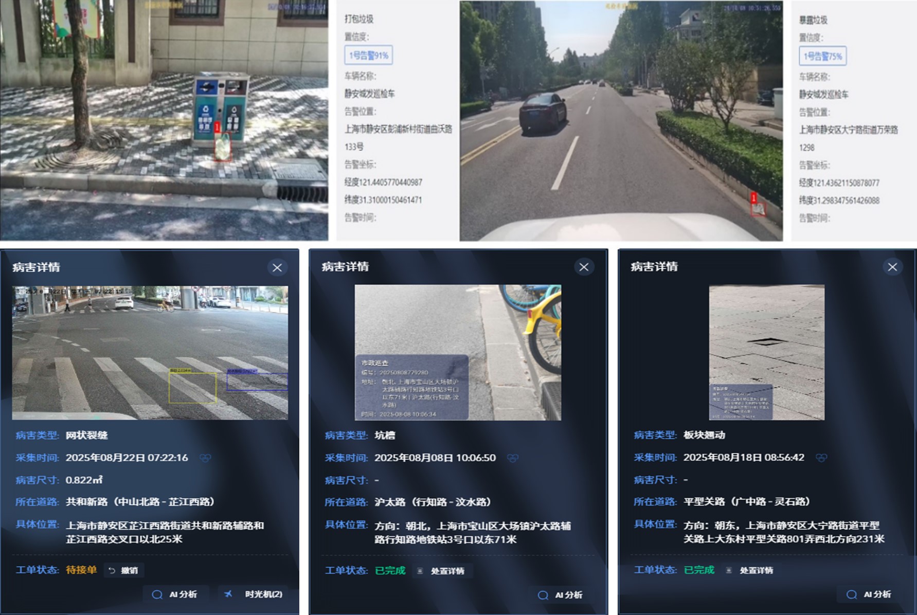 基于靜安區路況條件特點,一輛巡檢車一天8小時巡檢里程 60—70公里,工作量相當于10-12名人工巡檢員。2025年第二季度,3輛巡查車累計巡查16032公里,推送環衛案件8297件、市政病害7263件。環衛業務問題從發現到處置歸檔閉環只要20分鐘,市政病害發現能力和處置修復能力也都得到了雙重提升。