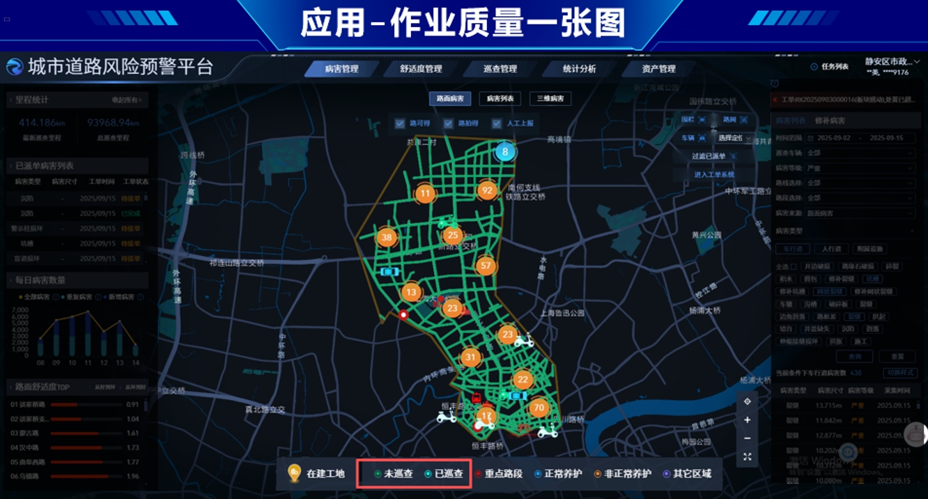 在這一環節,城發集團使用了“秘密武器”——“一張圖”管理。AI在圖上實時標注道路上的各種問題,用不同的顏色顯示路段環境狀況。一旦發現問題,系統立即調度附近作業力量迅速趕赴現場;同時,結合巡檢車的GPS軌跡,核對作業計劃,確保每條路都查得到、無遺漏。問題解決后,數據回傳到平臺,形成“巡—管—養—用”完整閉環,實現事前能預警、事中能跟蹤、事后能監管。
