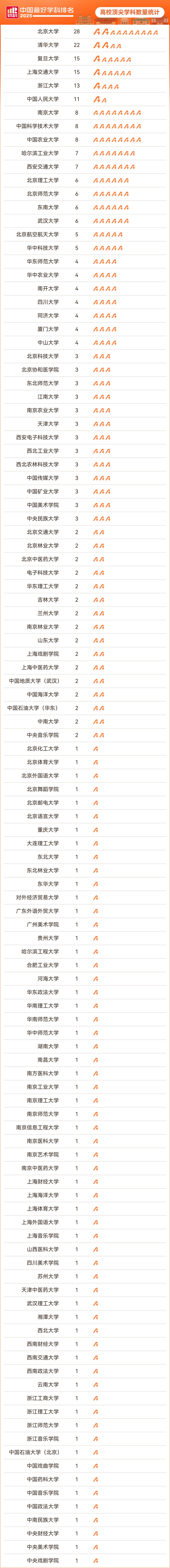 僅按照上榜學科的數量統計,中山大學和浙江大學分別有63個和61個學科上榜,名列前茅;清華大學緊隨其后,有58個學科上榜。其后,吉林大學和四川大學以57個和56個上榜學科分列第四與第五名,上海交通大學和武漢大學各有55個學科上榜,山東大學有53個學科上榜,北京大學則有52個學科上榜。