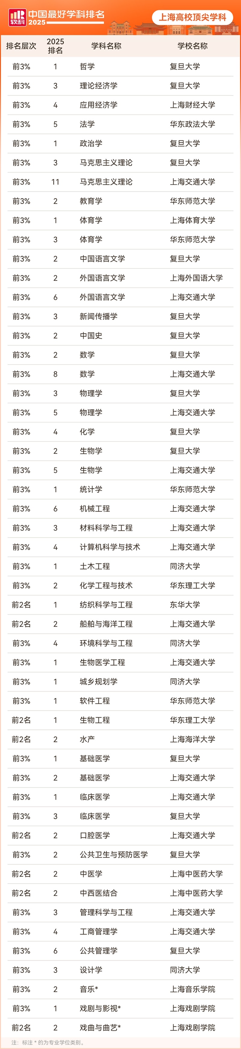 此外,華東理工大學、上海戲劇學院、上海中醫藥大學各擁有2個頂尖學科;東華大學、華東政法大學、上海財經大學、上海海洋大學、上海體育大學、上海外國語大學、上海音樂學院各擁有1個頂尖學科。其中,華東理工大學的生物工程、上海戲劇學院的戲劇與影視、東華大學的紡織科學與工程、上海體育大學的體育學均為全國第一的冠軍學科。