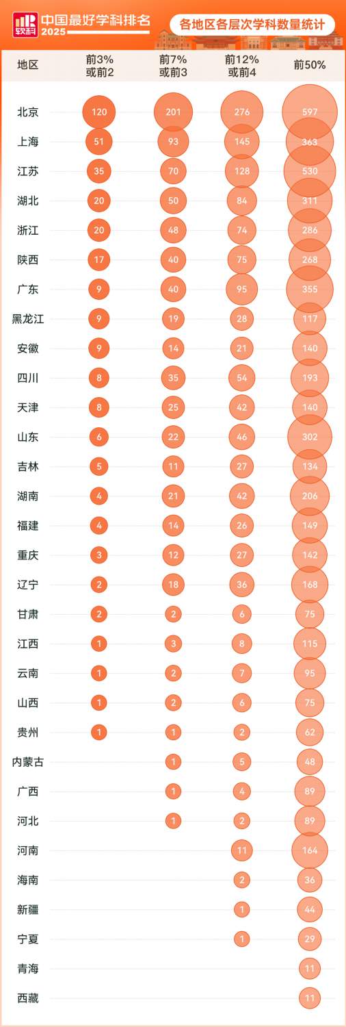 2025排名中,從分布看,上海共有24所高校的363個學科上榜,上榜學科總數僅次于北京和江蘇,學科整體實力穩居全國三甲。其后,湖北、浙江、陜西等省的中國頂尖學科數量處于國內前列,廣東、湖北、山東、浙江、陜西等省的上榜學科總數較多。