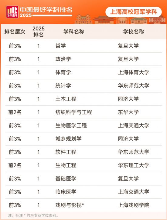 在上海擁有的51個中國頂尖學科(含一級學科和專業學位類別)中,復旦大學有15個頂尖學科,哲學、政治學、基礎醫學3個學科排名全國第一;上海交通大學也擁有15個,其中臨床醫學和生物醫學工程2個學科排名全國第一;華東師范大學和同濟大學均擁有4個頂尖學科,華東師大的統計學和軟件工程、同濟大學的土木工程和城鄉規劃學,均位居全國第一。
