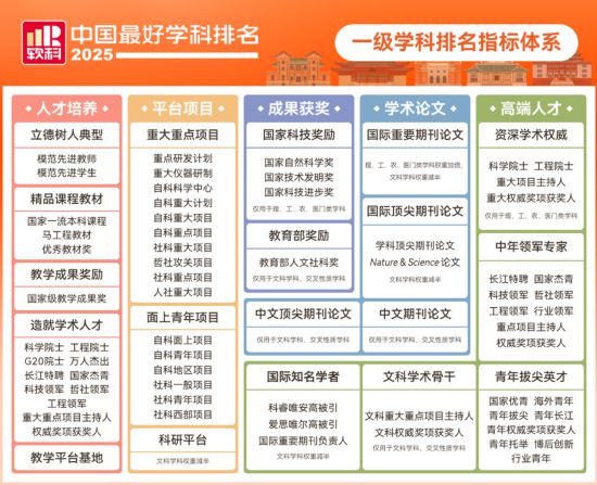 中國最好學科排名源自服務于高校學科建設管理部門的學科發展水平數據監測平臺,這些第三方數據源包括教育部、科技部、國家自然科學基金委員會、國際和國內文獻數據庫等。該系統使用人才培養、平臺項目、成果獲獎、學術論文、高端人才等方面反映學科競爭力的關鍵指標變量,跟蹤測量中國高校上萬個學科點的實時表現和相對位置。此次一級學科的指標體系,下設19個指標,共計200多項觀測變量。