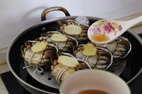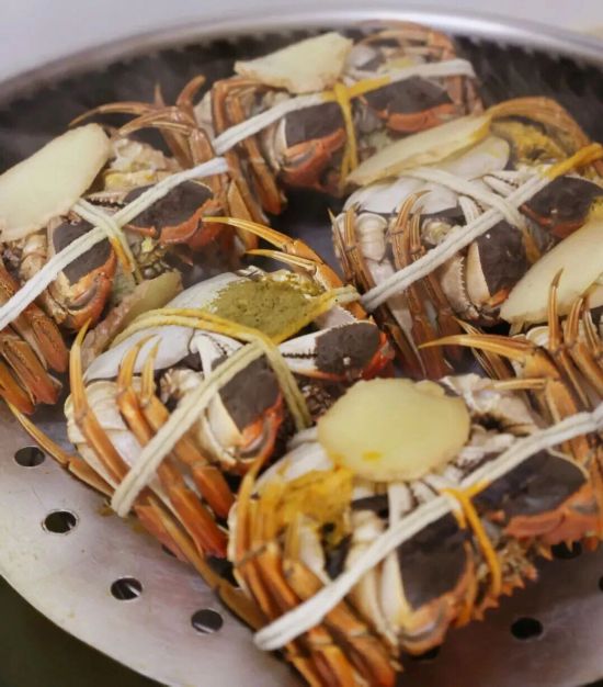 先處理螃蟹,用水沖洗并用刷子刷洗蟹殼、蟹臍、蟹爪縫隙,清洗后上鍋蒸,將蟹殼朝下、蟹身朝上,依次在蟹身上放姜片和少許黃酒去腥,蓋上鍋蓋大火蒸15-20分鐘左右,確保螃蟹完全熟透。