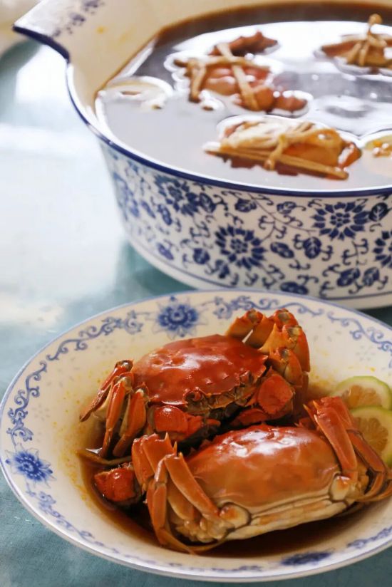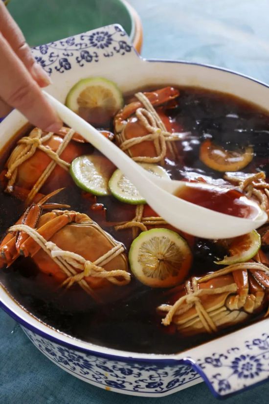 煮好的螃蟹撈出,放入冷卻的鹵汁,確保完全沒過螃蟹,撒少許檸檬片,再放入冰箱冷藏6-8小時,讓螃蟹充分吸收鹵汁的酒香和香料味即可。