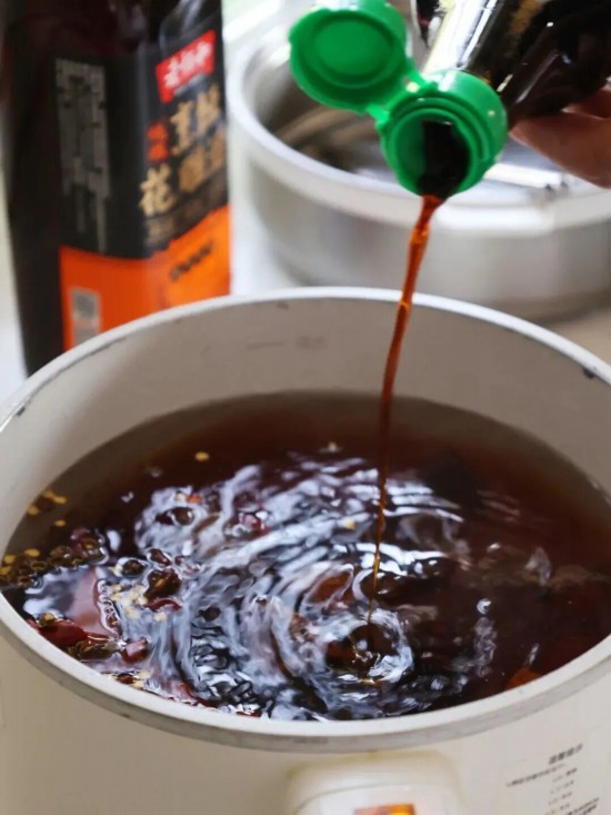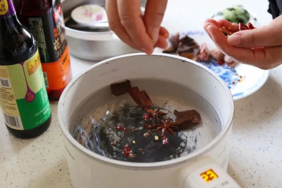 鍋中倒入適量清水,放入桂皮、陳皮、花椒、八角、干辣椒、生姜片、話梅、冰糖,大火煮開后轉小火煮10分鐘,讓香料味道充分釋放,隨后加入生抽、花雕酒,攪拌均勻后關火放涼,鹵汁就做好了。