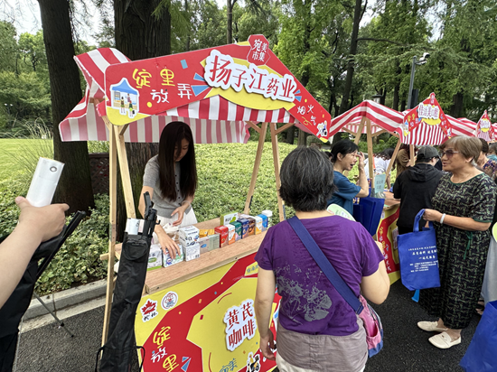 市集為居民提供了零距離感受傳統養生智慧的平臺。楓林街道社區衛生服務中心醫師現場坐診,三指輕搭腕間,將千年脈學智慧化作通俗講解,并傳授如按揉太沖穴、飲用菊花枸杞茶等日常養生要訣,圍觀居民紛紛體驗,驚嘆“老祖宗的學問真神奇”。靚揚中醫養生、愿君健康調理中心帶領居民體驗“八段錦”“中醫八虛拍拍操”,還為居民點按內關穴等技巧解暑熱煩悶。揚子江藥業的黃芪咖啡攤位別具匠心,咖啡師將黃芪補氣固表之效融入醇香咖啡,調制出溫和提神的“元氣加油站”。