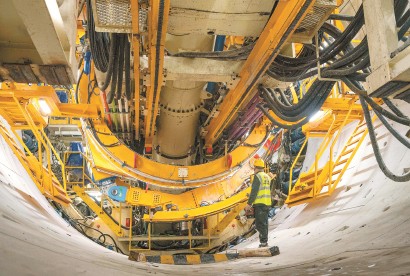 圖為工作人員正在操作盾構管片拼裝機進行管片拼裝。
